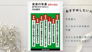 実用書 『未来の年表 業界大変化 瀬戸際の日本で起きること』河合雅司を読んだ感想【ネタバレ一部あり】 少子高齢化と人口減少により、日本は今まさに「業界大変化」の瀬戸際に立っています。私たちの仕事や生活に起こる変化とは?2030年、2040年を見据え、日本で生き残るために必要なマインドを今すぐチェックしてください。 2026.04.07 実用書自己啓発本