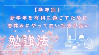 使って(購入して)よかった本以外のおすすめ 【学年・進級先別】新学年を有利に過ごすために春休みにやっておいた方が良いこと ご入学・ご進級おめでとうございます!でもほっとしている時間はありません!短い春休みを有意義なものにするために、ぜひ勉強の計画やこの先の見通しを立ててください。 2026.03.23 使って(購入して)よかった本以外のおすすめ